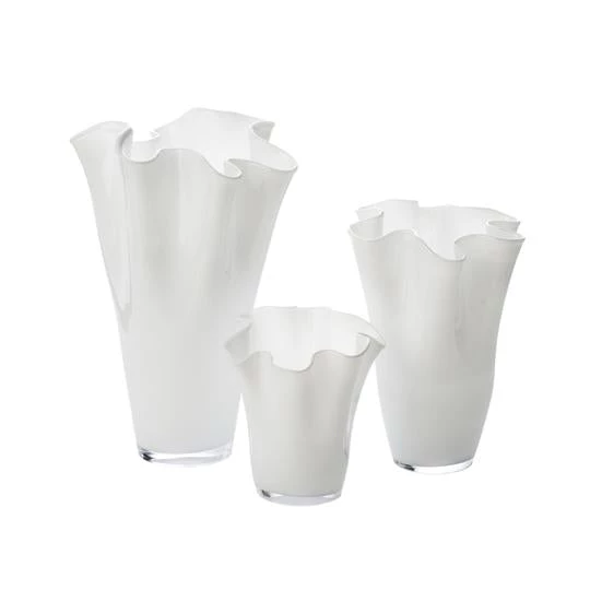 Abigails Ruffle Glass Vases make flower arranging so easy. The flowers seem to just arrange themselves. Three sizes are offered in these pristine white glass containers. Made in Portugal. Small size