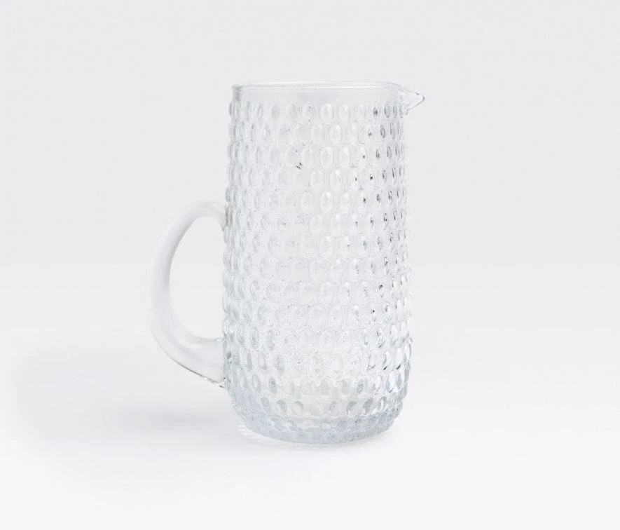 The cylindrical Claire, a modern update on a vintage classic. Oval-shaped beads add texture to the hand blown glass pitcher while a smooth handle makes for a sturdy hold.