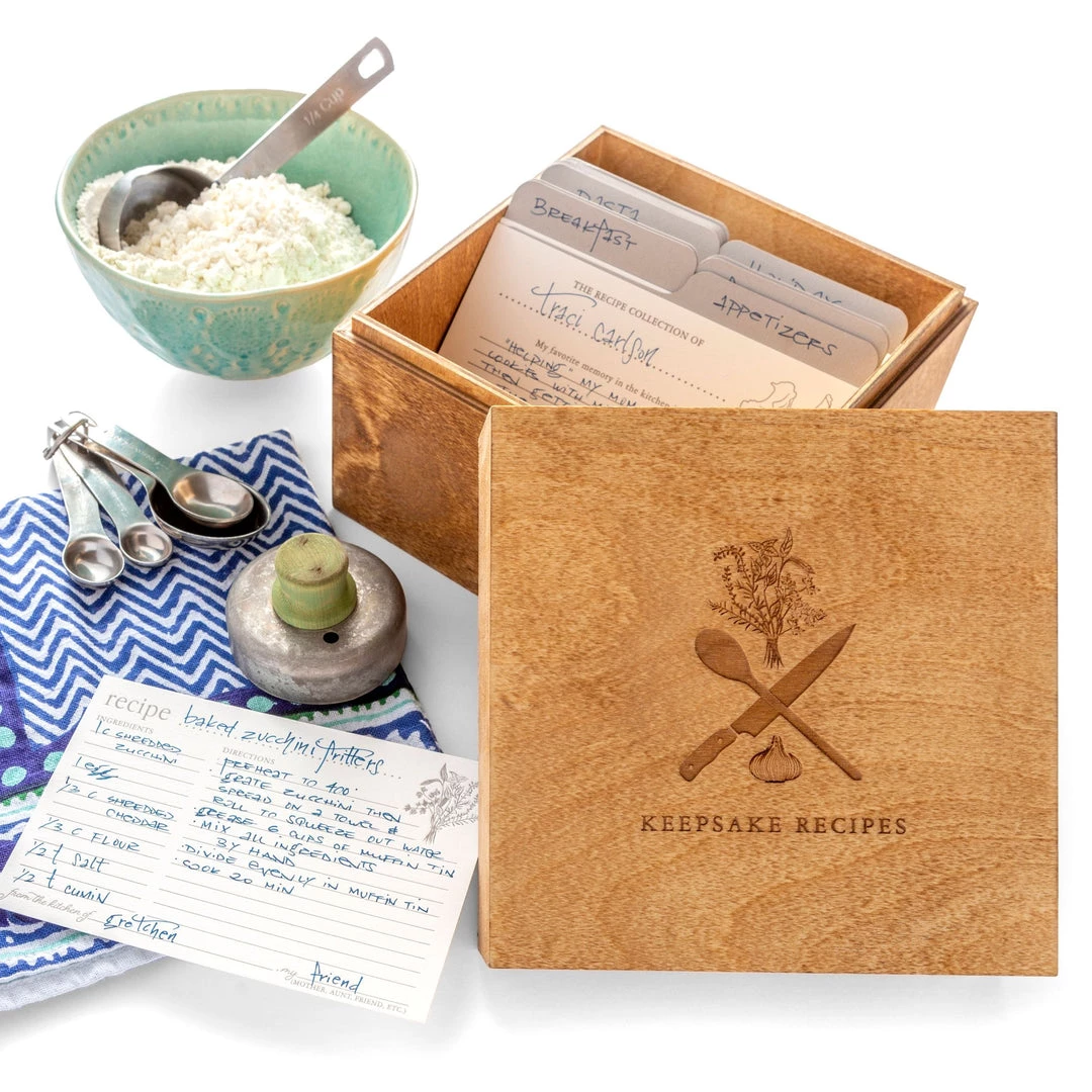Wooden heirloom boxes for memories, photos and treasures! Includes a letterpress Chefâs Biography card to tell a little bit about the chef, 20 letterpress recipe cards to record your recipes, and 12 blank divider tabs to organize. Each handmade box has the âKeepsake Recipesâ design laser engraved onto the lid. The wood grain will vary on each box, making it truly one-of-a-kind! Each box is packaged with a letterpress tag and ribbon. The memory cards are packaged in a clear sleeve inside the box. Box outer dimensions are 6.75â square x 5.375â tall and can hold 4âx 6â or smaller photos.