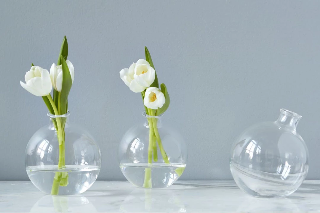 Hand blown by European artisans, these round bud vases are sophisticated in shape. Use as the perfect flower holders or fill with candies or nuts.