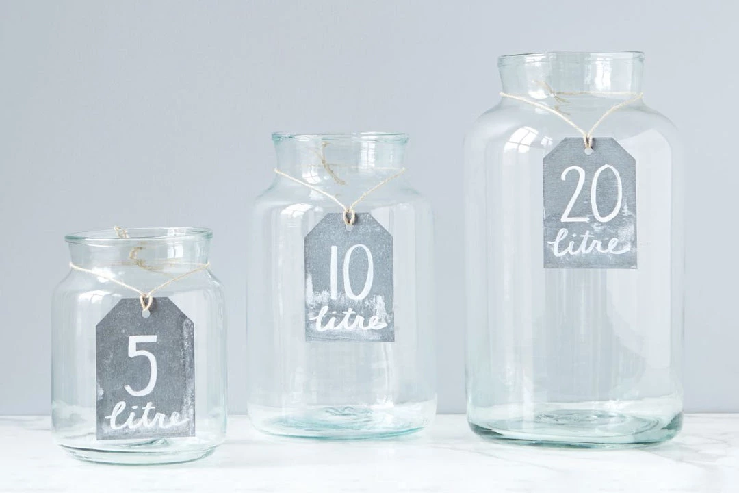 Wide mouth mason glass jars have been used for summer harvests in villages throughout Europe. Made from recycled blown glass, thse jars can be used for in everyday decor or a variety of items throughout your house.