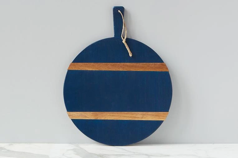 These reclaimed wood boards are distinguished by two strips of contrasting timber. For a modern spin, the serving board boasts a navy 100% plant-based, food-safe wax finish and the slats have maintained their exquisite organic beauty. Ideal for use as a charcuterie plate, showcasing bread, cheese or fruit, the wood bread board can also be used as a decorative kitchen accent.