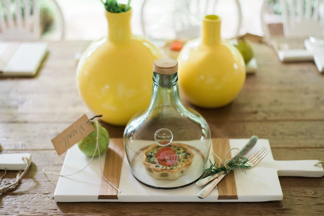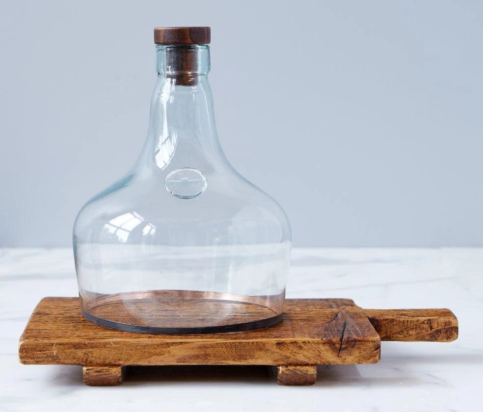 Prefect in practical use as a fruit, cheese or bread cloche, we also them for as a table accent. This demijohn cloche is made made from blown recycled glass, rimmed with tin and topped with a reclaimed wood cork.