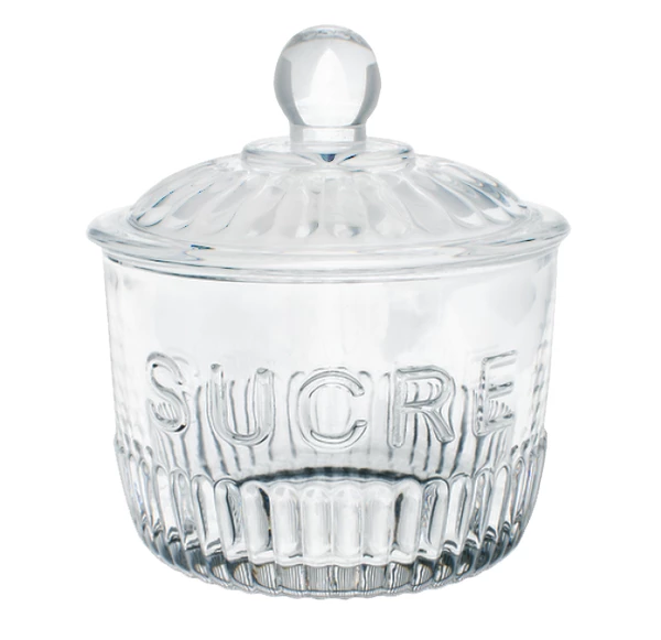 Round jar with lid featuring ribbed edging, fluted accents and raised text details reading “sucre”–sugar in French. Adds a vintage touch to the breakfast table, and coffee and tea accessories.
