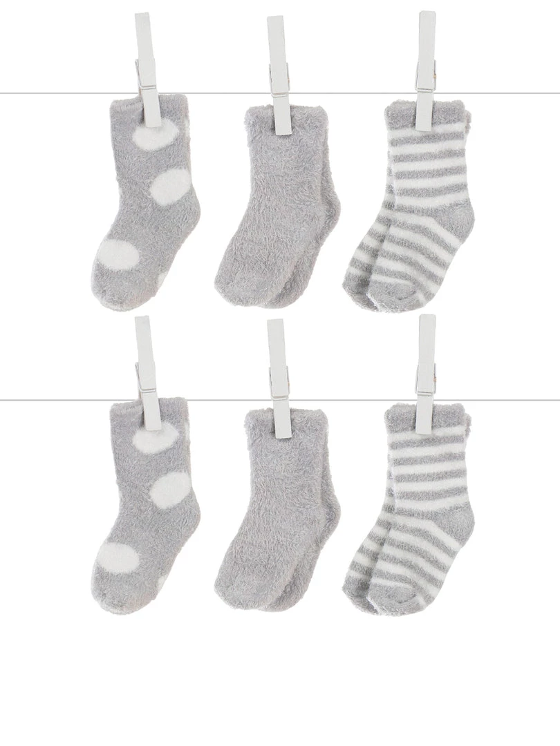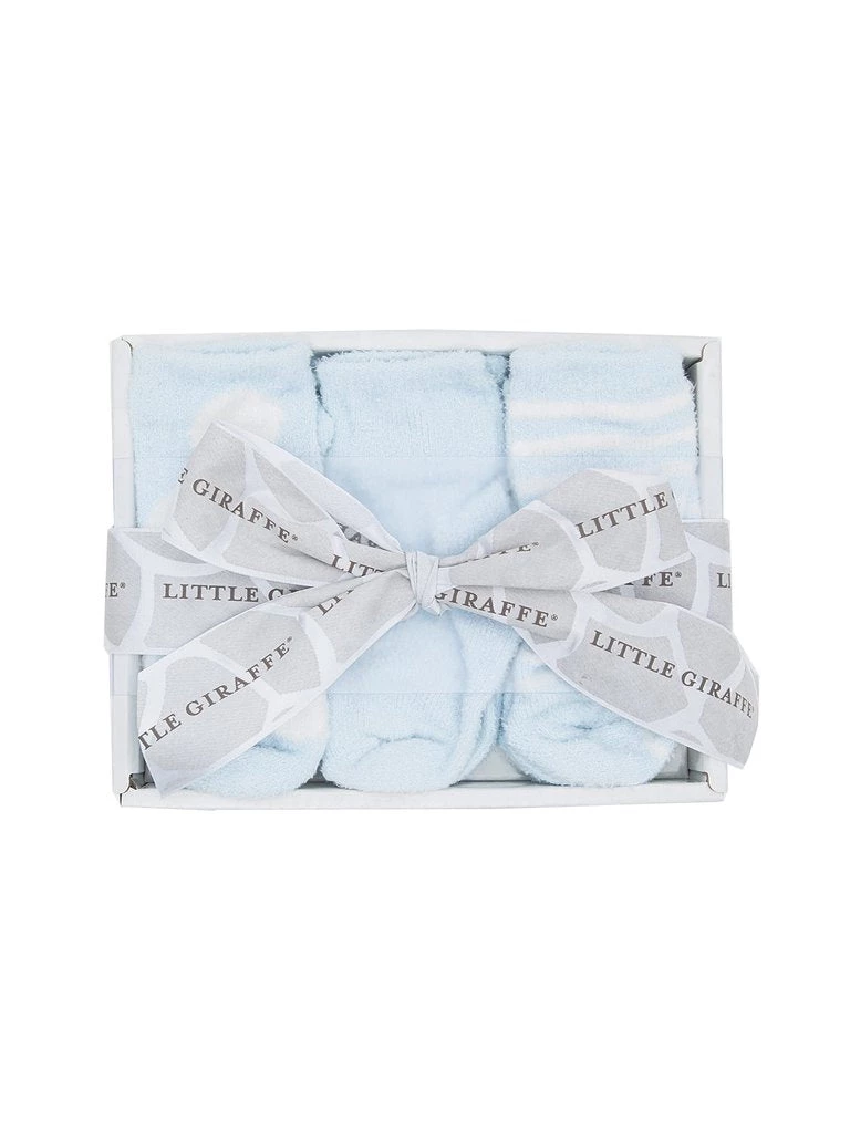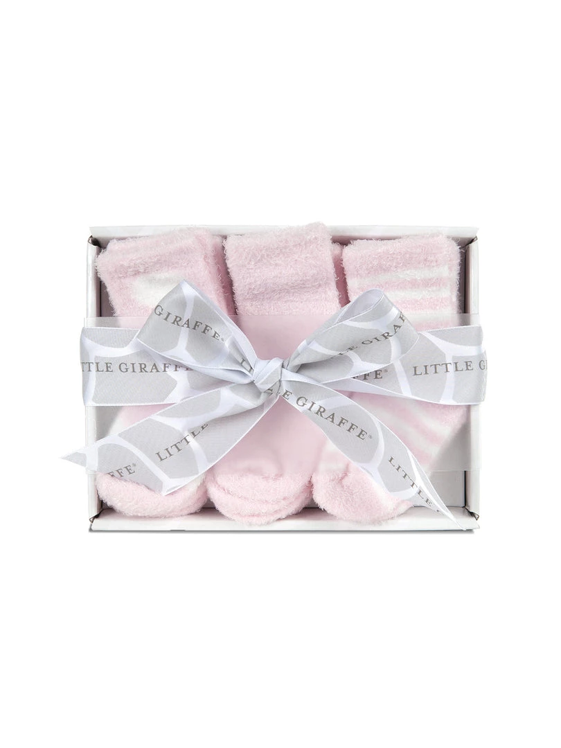 Keep baby’s feet warm with 6 pairs of socks in Little Giraffe’s silky soft feather yarn. Playful dot, stripe, and solid prints adorn these super fuzzy socks so you can match or mix. And Little Giraffe’s special cross stretch insures these socks stay on. Packaged to perfection in a giraffe print gift box, this box of socks is always a hit at baby showers.