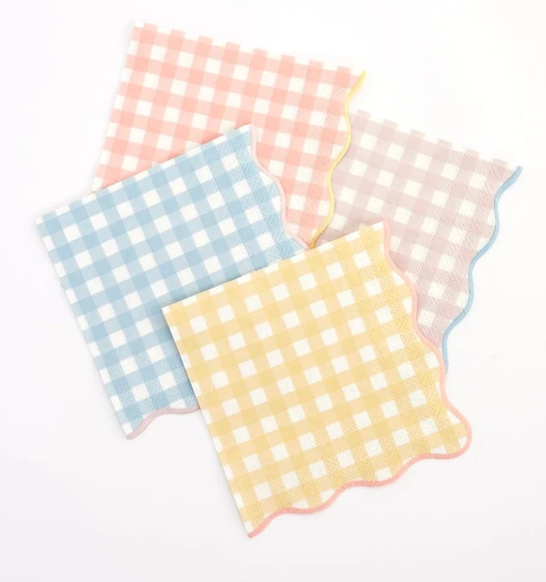 - The napkins come in 4 gingham print colors – coral, blue, yellow and pink