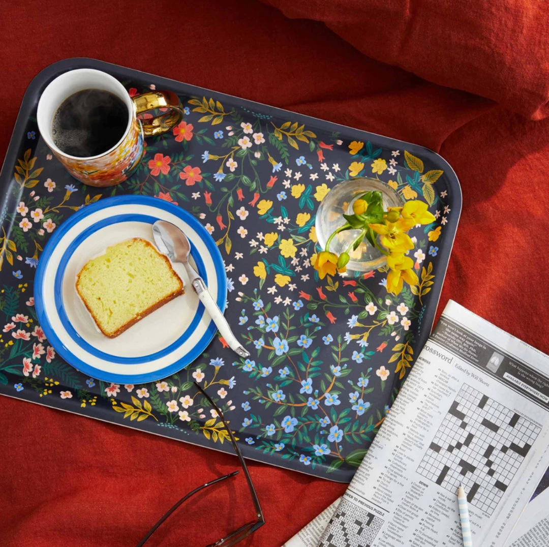 Our bent ply trays are as versatile as they are beautiful, handmade in Sweden from lightweight, FSC-certified birch. The laminated finish makes them perfect for entertaining inside and out, or adding a pop of color to your decor. Our Wildwood design pops on a navy background, and the larger size is perfect for a serving up a tray of snacks or drinks. DETAILS