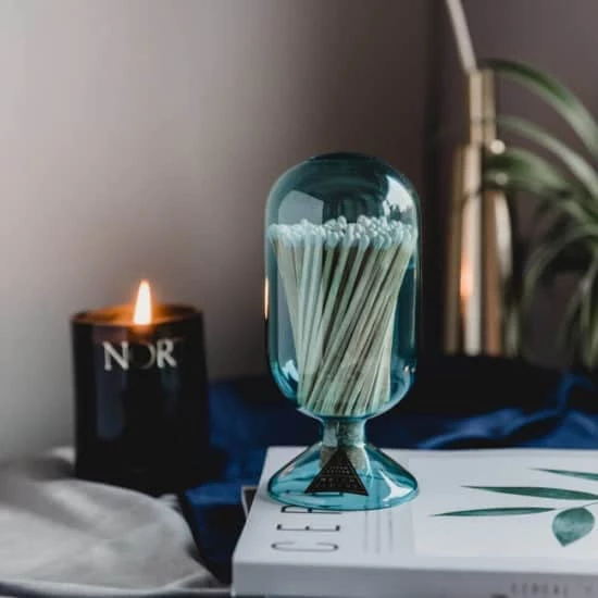 Holding 4″ matches and updated it in a sophisticated color palatte, each piece is hand blown and fitted with a cork stopper in the bottom. Once the matches are gone, it can be a curiosity used to display a found specimen.