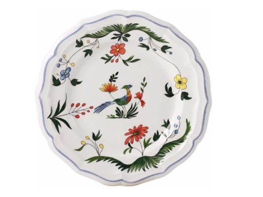 Exotic Birds is a true work of art for the table, an iconic piece of history and royalty. Its motif was originally created in 1738 and retouched with vivid new color in 1865 by Gien. A legacy of French earthenware and design, its graceful scalloped shape, hand-painted blue filet and beloved birds are ideal for dressing an exquisite table, or simply embellishing the everyday.