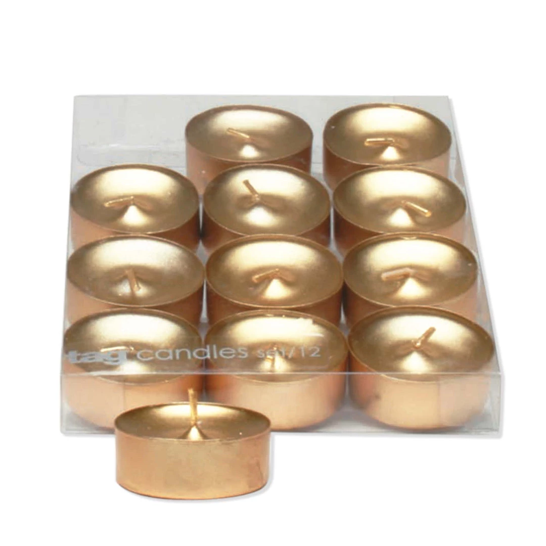 light the night. set of 12 tealight candles comes in elegant gold. set on your christmas table for a sophisticated look or set on a side table for a bit of christmas magic in any room of the home.