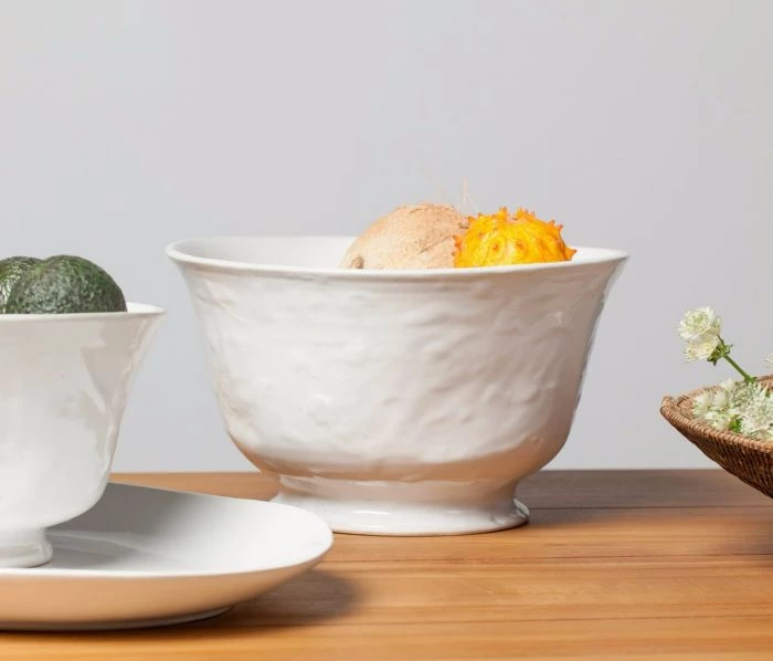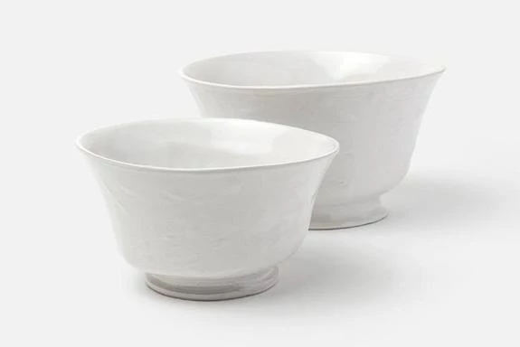 The classic footed shape of the Clara bowl is made more casual by the textured façade. Crafted from stoneware, these pieces carry on the tradition that originated in the 15th-century, bringing a venerable craft to the modern table.