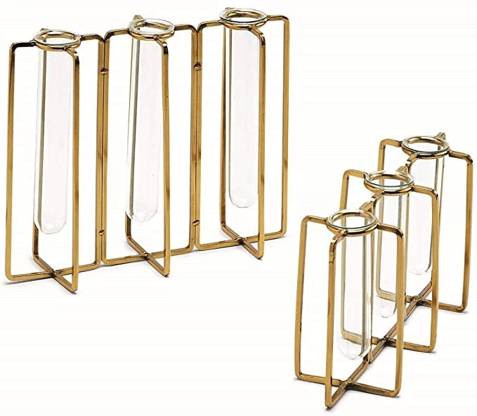 This beautiful hinged vase will add a very unique touch to any table. This vase is one piece made of three connected 5” tall vases with a beautiful gold finish.